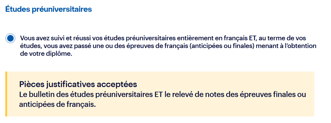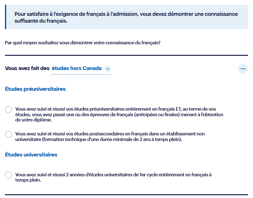 Si vous faites une demande d'admission et que vous déclarez avoir fait des études dans un établissement anglophone ou dans un établissement que le système ne reconnait pas comme étant francophone, une seconde sous-section apparaîtra afin que vous puissiez sélectionner la situation qui s'applique à vous. Cela a pour but de vous préparer à respecter l'exigence de français en téléversant ensuite les documents appropriés sur le Centre étudiant après la soumission de la demande d'admission.