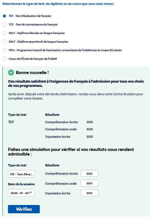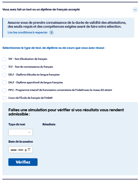 L'évaluation de la connaissance du français est gérée par UdeM français, nous vous recommandons de communiquer avec leur équipe pour plus de renseignements.