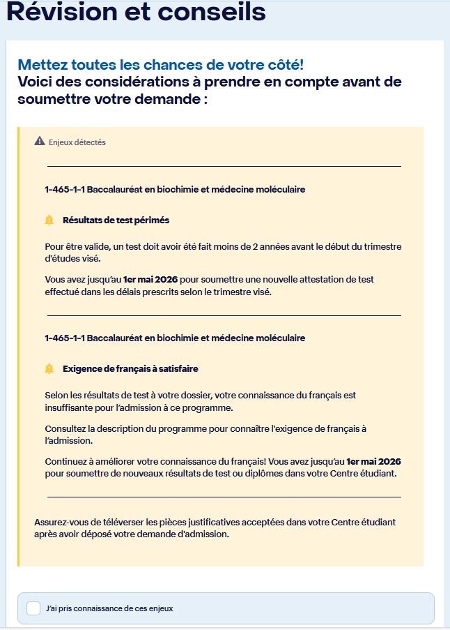 Attention! Si les résultats sont insuffisants ou si le test n'est plus valide, une section s'ajoutera dans le formulaire d'admission sous le nom de Révision et conseils pour vous avertir. Voici un exemple: